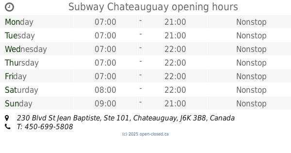 It is also possible to : Edit these OPENING HOURS of Restaurant Subway In Chateauguay, 230 Blvd St Jean Baptiste, Ste 101,